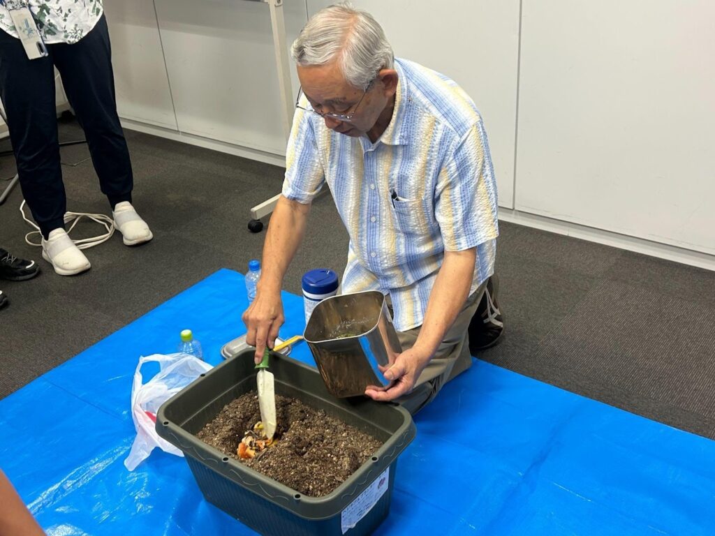 松本さんは、持参した小さく切った生ごみを、プランターの中の黒土に穴を掘って入れた。そこへ、少し水を加え乾いた土をかぶせ、表面を平らにならした。