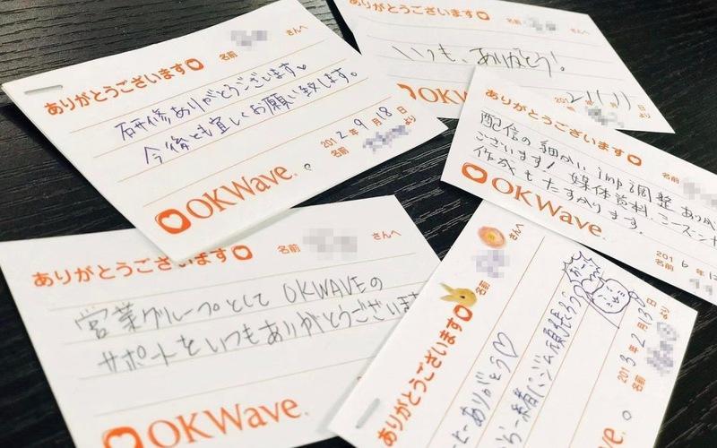 社内文化として「ありがとう」を増やしたいという思いから、オーケーウェブでは紙のサンクスカードを使った社内施策をスタートしました。毎月、社員一人ひとりにカードが配られ、1カ月に10枚以上、誰かに感謝を届けるというルールが設けられました。