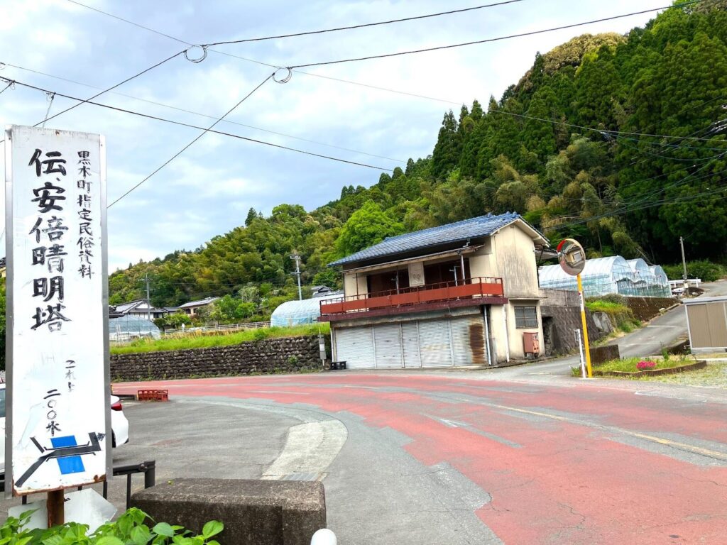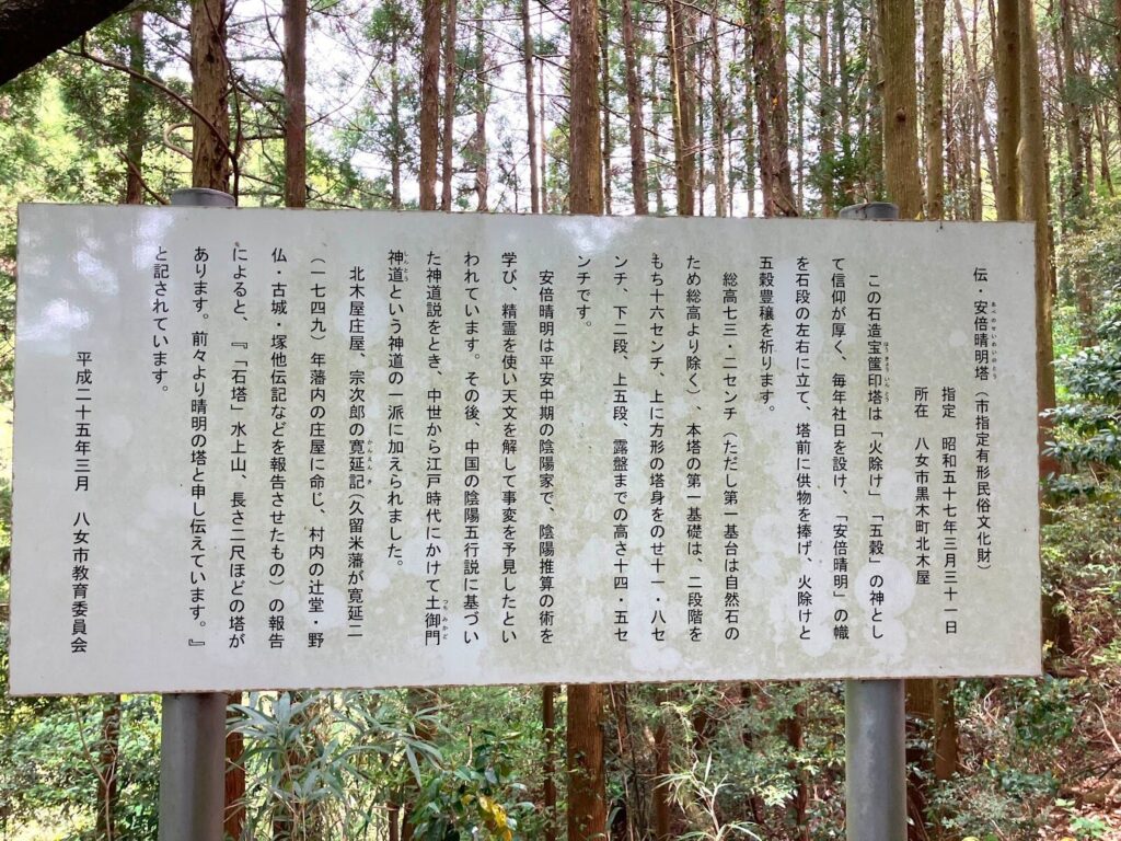 看板は「伝・安倍晴明塔」を文化財として示す説明版でした。文化財に指定されたのは、昭和57年3月31日です。この看板は八女市教育委員会が平成25年3月に設置したもので、「石造宝筐印塔」(いしづくりほうきょういんとう)とも。