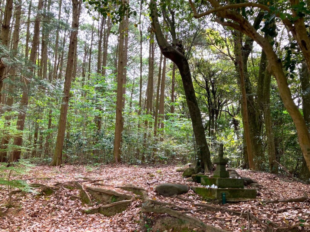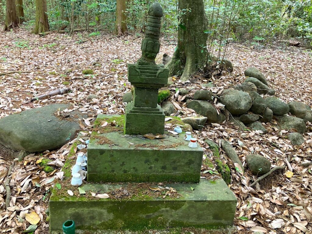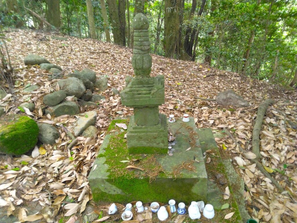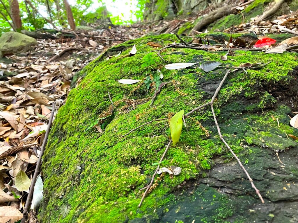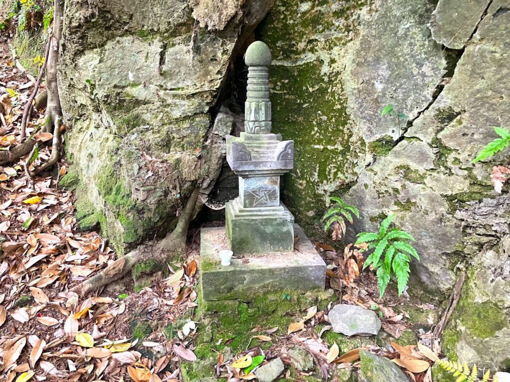 途中には岩が苔むしています。足を滑らせないように、用心して進んでいきます。もうすぐ頂上に到着するかなという時に、岩かげに何やら塔のようなものがありました。