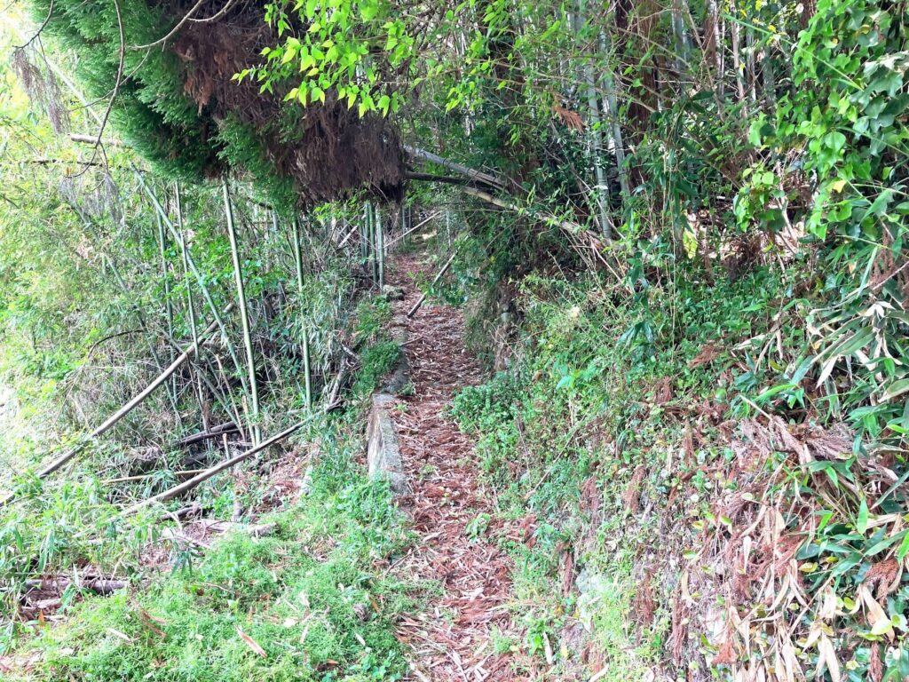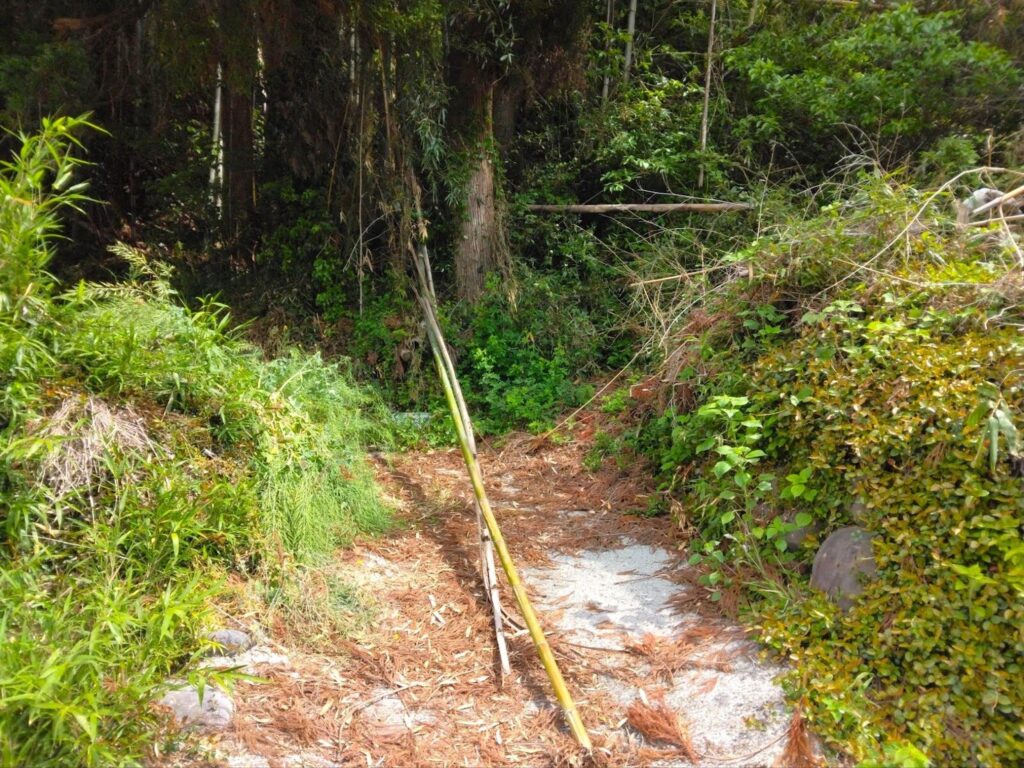 道幅はかなり狭く、車は絶対に無理。歩くのもすれ違うのもやっと。しかも倒竹や倒木が上から迫ってきているし、道には落ち葉が積もっている。