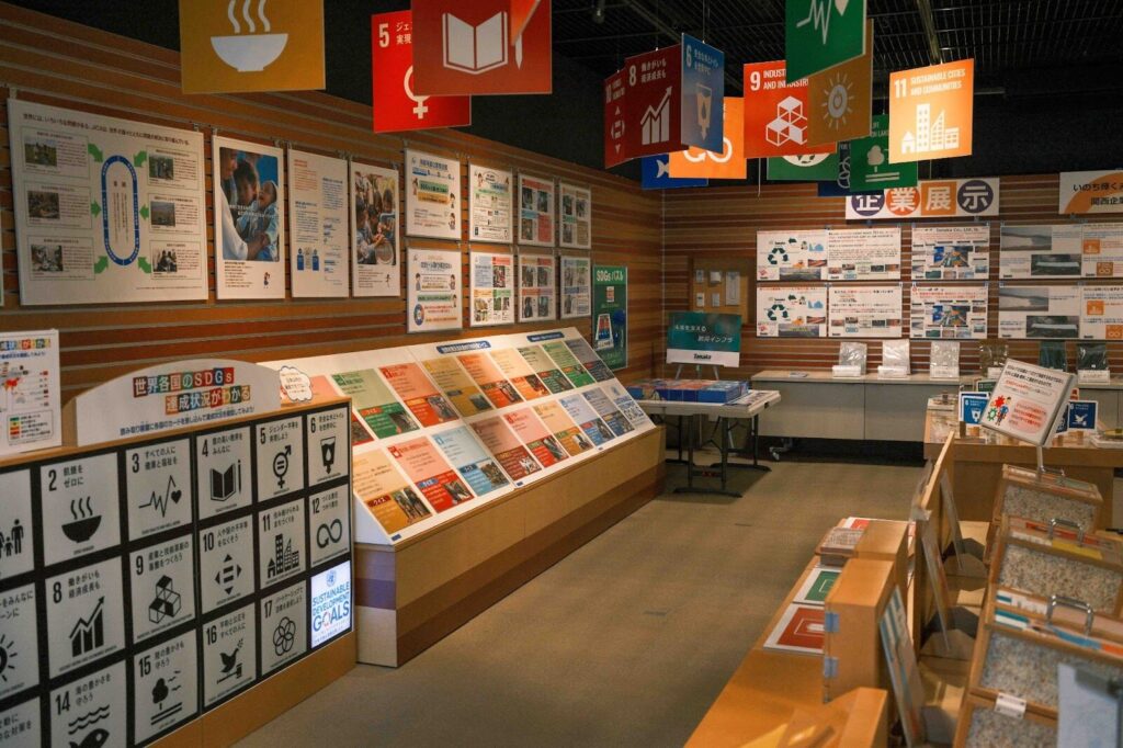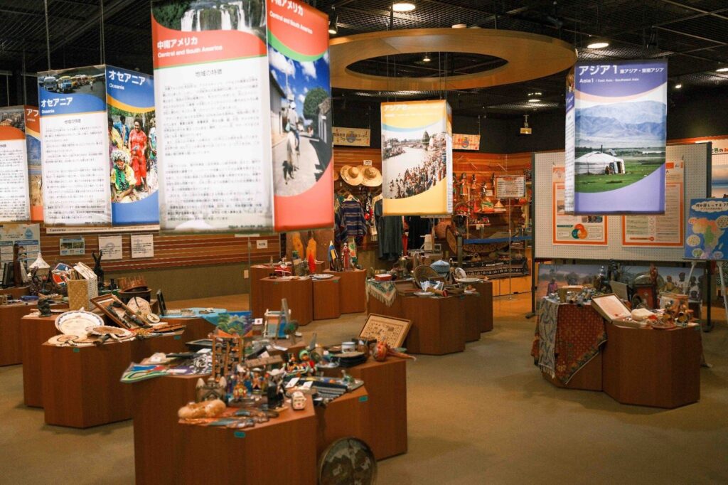 JICA関西の魅力は食事にとどまらない。1階には世界の文化や国際協力を学べる展示スペースがあり、民族衣装の試着や写真撮影も可能である。国旗や通貨、生活道具などの展示もあるため、子どもにとっては社会科見学のようなワクワク感がある。