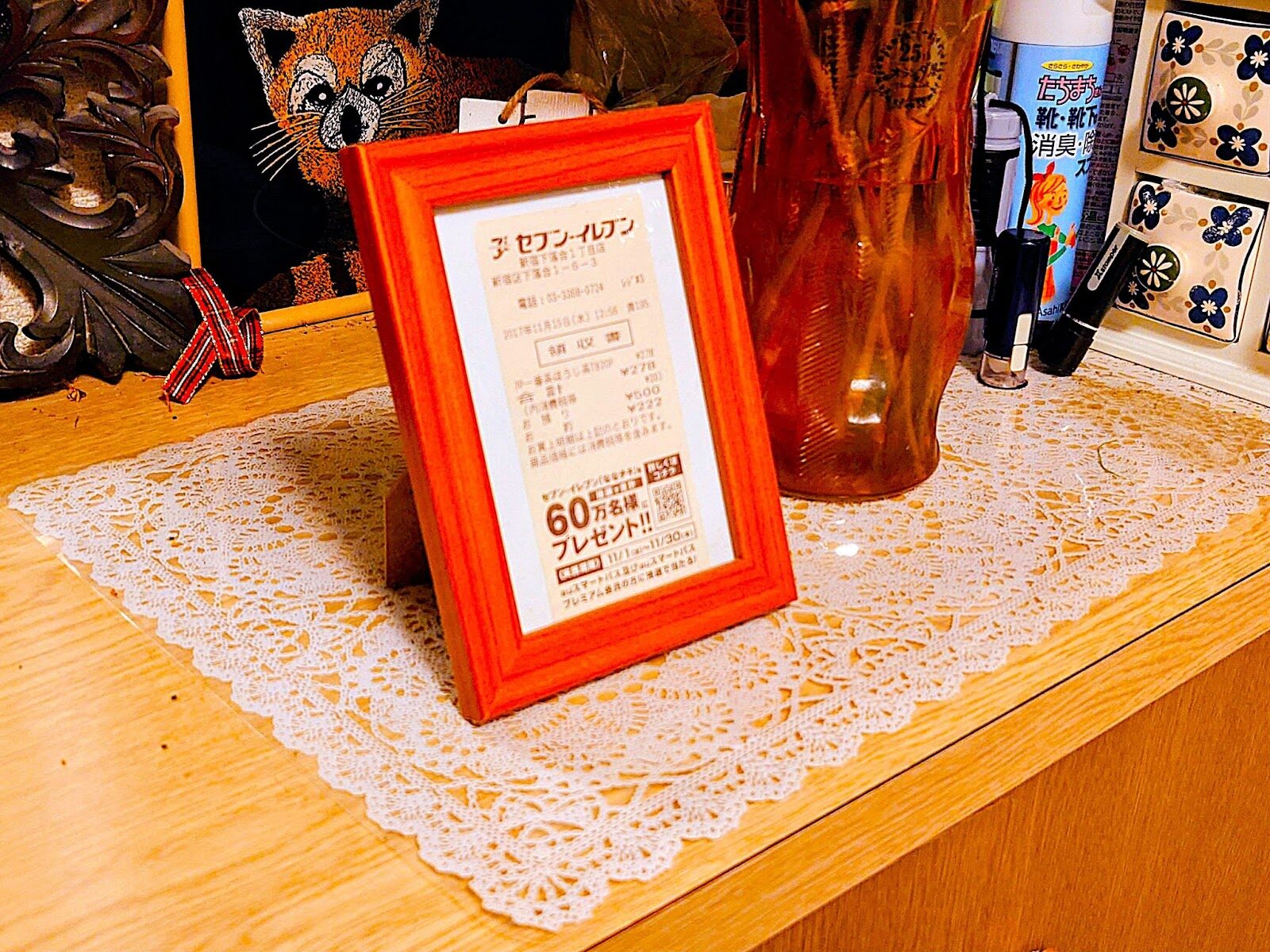 そしてある時ふと、そのレシートを小さな写真たてや額に入れて、オブジェにすることを思いついたのです。