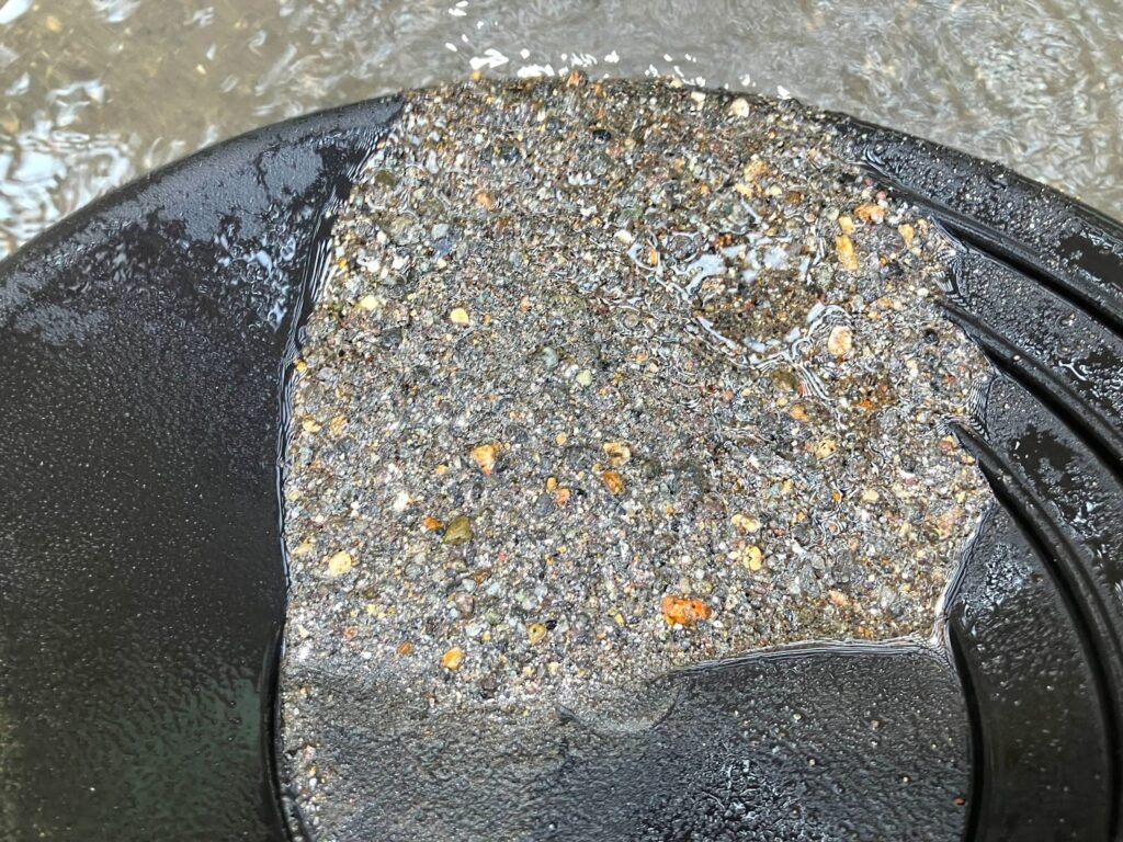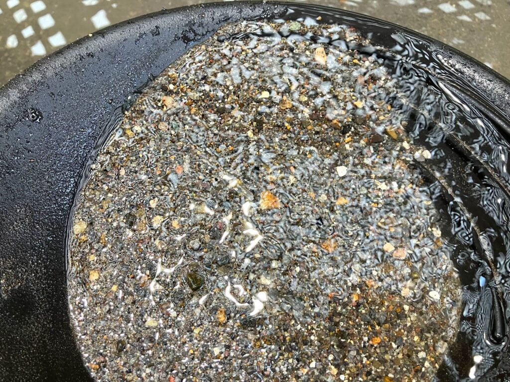 ぐるぐるとお皿の中で水と砂を時計方向に回す。遠心力で大きな砂利をとばし、徐々に小さな石と砂が残る。もう少しで砂金と対面できると思い、慎重にお皿を回し砂を飛ばしていく。