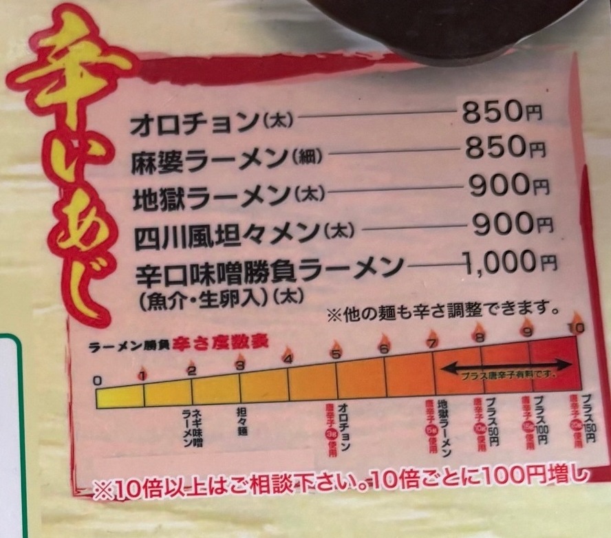 ここまで読むと「辛いものが苦手な人は食べられないのでは?」と思う読者がいるだろう。しかし安心してほしい。ラーメン勝負は10段階に分けて辛さの度数を調整することができるのである。今回筆者が頼んだオロチョンは辛さのレベルでは中間の「5」に相当するものであり、それほど辛いとは感じなかった。辛いものが好きな人がいれば度数を上げることも可能で、逆に苦手な人は下げて注文することができるのである。なお10倍以上の場合は10倍ごとに100円増しで、要相談が必要である。