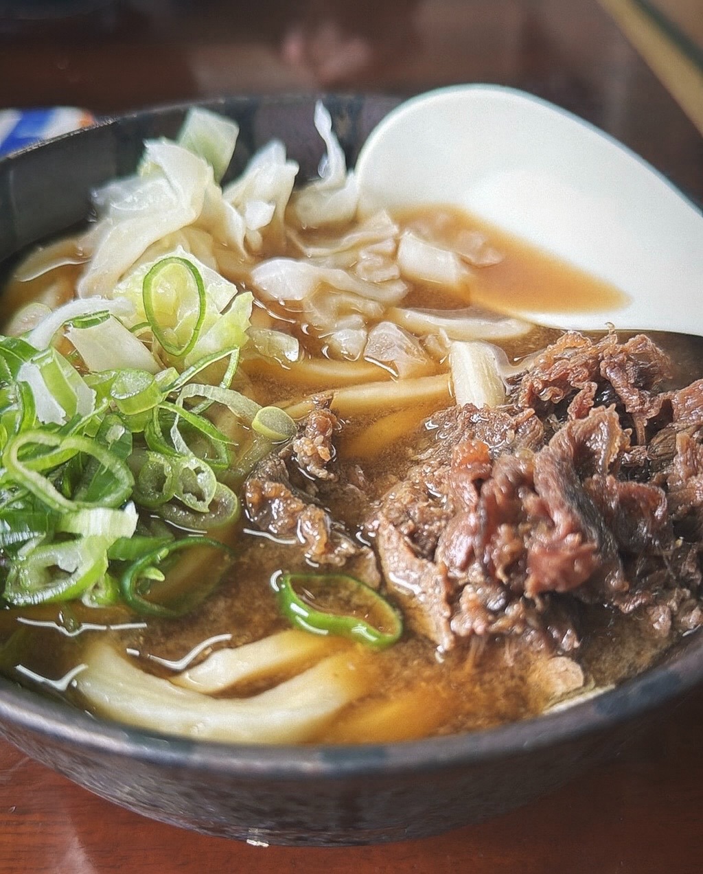 私は「ふじや」といううどん屋さんに立ち寄り、肉うどんを注文しました。出てきたのは、馬肉が乗ったどんぶりでした。だしはみそとしょうゆを基調に、昆布や煮干しの穏やかな香りが立ち、硬い麺にほどよく絡みます。