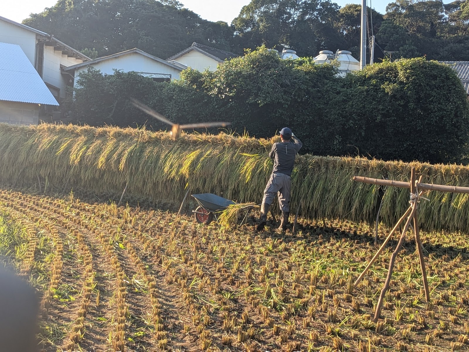 一方で、壱岐では束ねた稲穂を一つひとつ枝の土台にかける乾燥が多い。家族で小さな田んぼを守っているという人が多く、伝統的な米作りを代々受け継いでいくことで昔ながらのやり方が根付いているようだ。