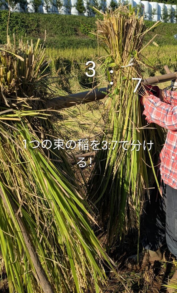 小さな稲刈り機で稲を刈り終えると、刈り残した稲を鎌で刈り、稲わらで「くびる(結ぶ)」。束が出来上がると、次は細長い木の棒を金づちで「コン、コン」と打ち込む音が田んぼに響き渡る。これは乾燥させるための土台を作る音だ。交差にして打ち込んだ棒を固定し、竹を掛けると土台は完成である。ここから一つずつ 稲穂をかける作業が始まる。一段目は束ねた稲を7:3の割合で分けて交互に掛けていく(3枚目の写真参照)。